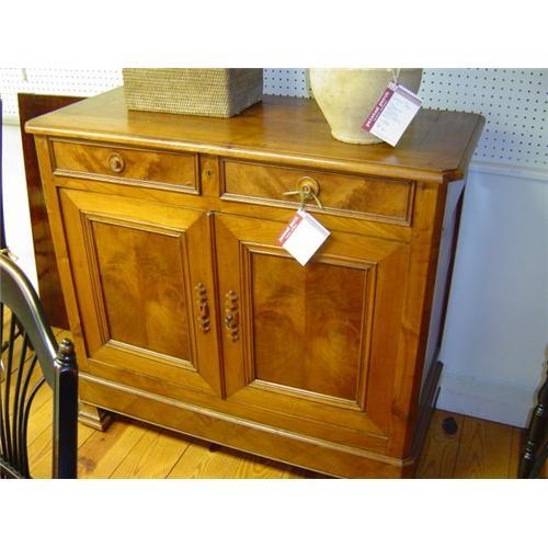 If French country , wonderful book matched grain and smaller size are what you desire, this piece is for you. this buffet has two fabulous drawers and doors with exceptional cherry grain and color. the doors open to a shelved area . the drawer pulls and escutcheons are also made of cherry. the sides are panelled