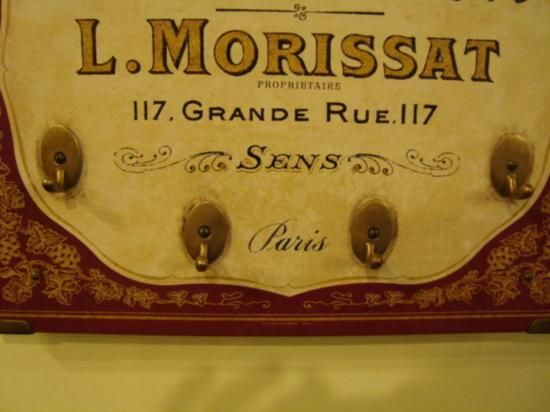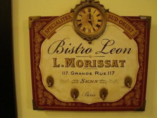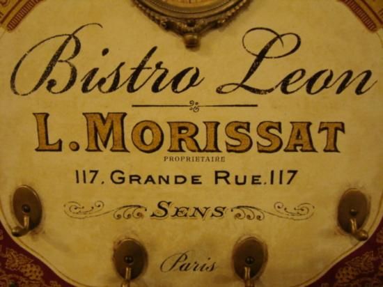 Very nice reproduction of French clock "Bistro Leon, L. Morissat, Paris" with its key holders. This clock is made individually, hand assembled with the finest composents...hand-antiqued, die-cut steel hands with time-worn patinas and beaut