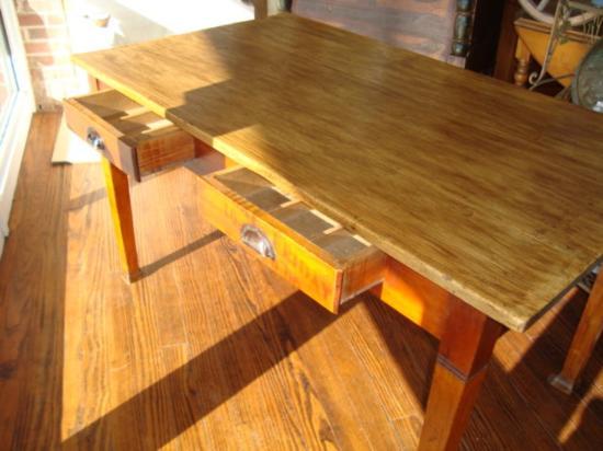 Here is an Antique French country Farm table, made of French solid pine in the early 1900's by a cabinet maker from Champagne Region (Eastern France). Two drawers on the front. w:55"/ d: 32"/ h: 30.5". It will be great for a kitchen table or used as a desk. Very sturdy, nice patina!!! A nice piece and a very good price for this small part of France in your home. For the shipping...don't worry,we ship from Texas (not from France)!