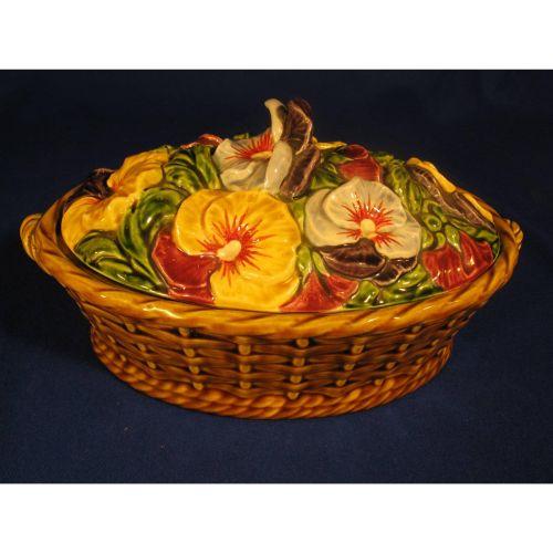 French covered dish, “sarregue mines” marked, crazed discolorations, 12" long