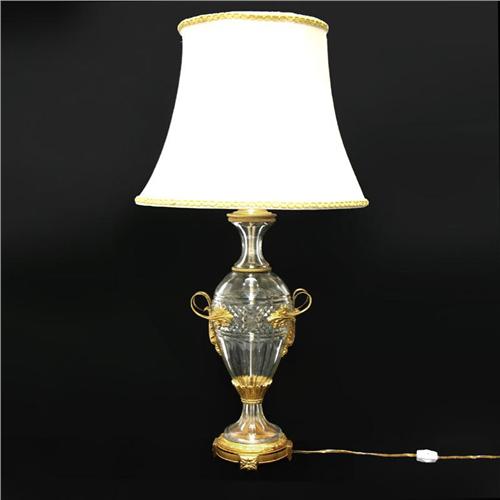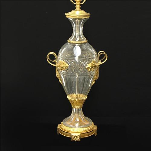 French cut crystal and bronze dore lamp; crystal with faceted and cross hatch decoration; bronze mountings and acanthus leaf handles; on cast bronze base with laurel wreath design; 17" high to top of bronze cap; stamped Made in Austria; with 2001 receipt from Antique Showcase of Philadelphia, 1625 Pine Street in Philadelphia; no visible defects