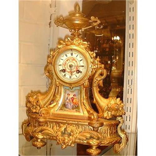 1880 French decorative clock with nicely hand painted porcelain panels unrestored but in working order.