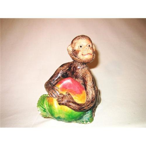 Beautiful French figurine of an Monkey made in Majolica, very colorful he is holding an apple