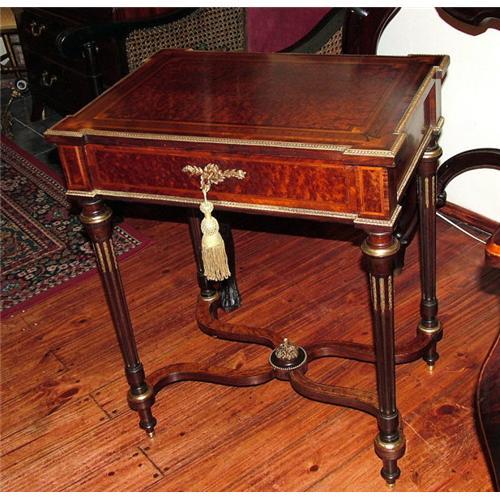 This antique French table with fine root of mahogany marquetry inlaid , bronze edge molding, and fine Maple interior divisions, probably used to store some kind of game parts or may be Cards , dates from the Napoleon III Empire , around 1870 . It is an original Period piece, in rare MINT conditions, measures 25 inches wide by 17 inches depth , and 29 inches high. SHipping within US $ 275 ... this is a quality item