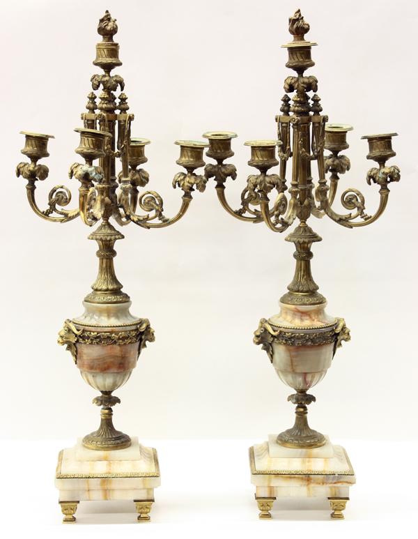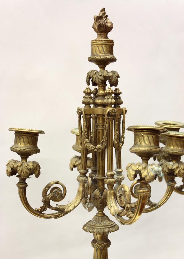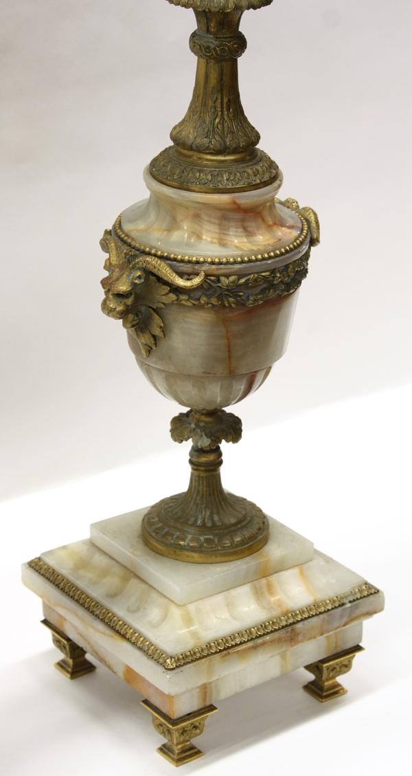 Pair of French gilt bronze and onyx candelabra circa 1890, executed in the Louis XVI taste, the flame form finial surmounting the four lights having acanthus and wreath detail supported on a fluted standard terminating at the onyx urn centering the rams head mounts and rising on a footed square plinth, 25''h x 7''w