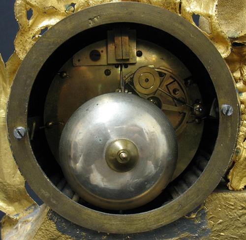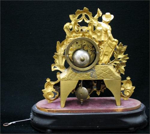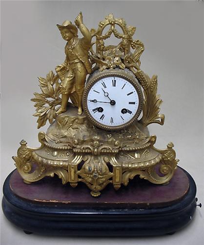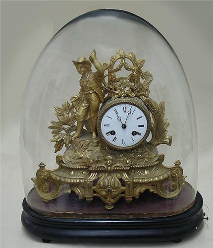 French gilt bronze clock with musical base; figure and tooled swag and wheat sheaf decoration; porcelain face with Roman numerals; French scroll feet; clock sits on wooden base with a start-stop pull musical box (working); with glass dome; C.1830; 17" high x 14" (no visible defects)