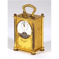 French gilt metal carriage clock with eight day movement and enamel dial, decorated with panels of nude women and cherubs, 11cm high