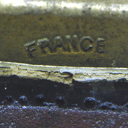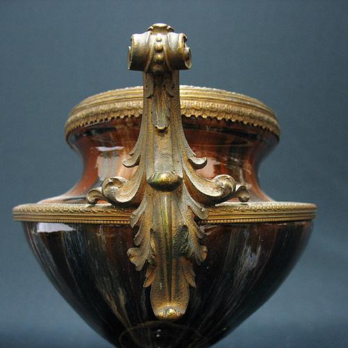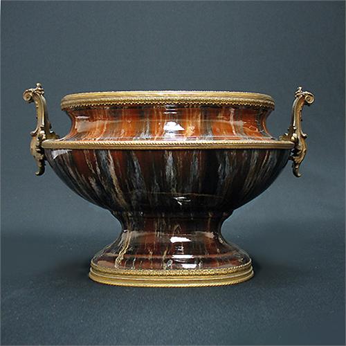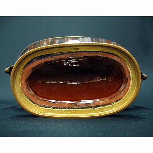 French glazed redware center bowl with bronze ormolu mounting and handles; stamped France on bronze base; early 20th C.; 7 1/2" high x 12" x 6" (bronze mounting is loose around mid-section)