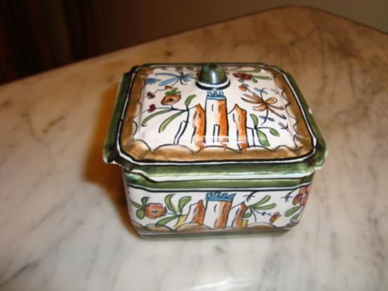HIGHLY COLLECTIBLE FAIENCE FROM FRANCE. Faience box with its lid. You can see on photo #4 insciption "La Faiencerie, peint main"...for "hand-painted" + signature of the French artist. A little part of France in your home. Fair condition (2 chips at bottom