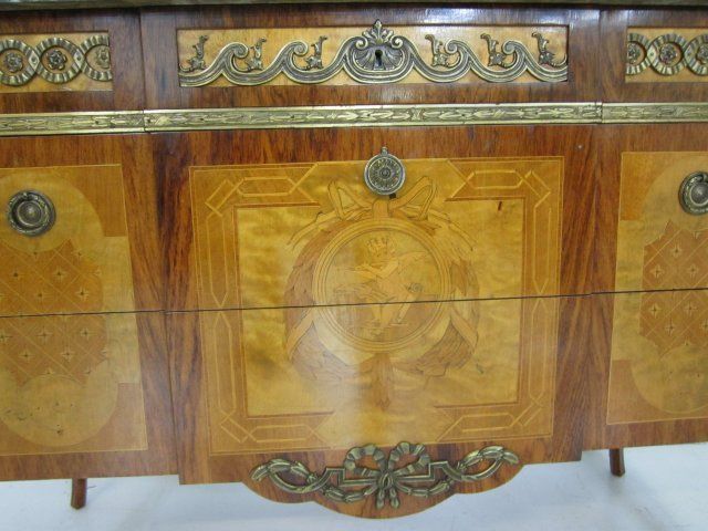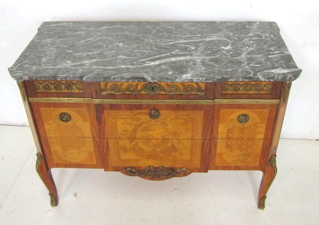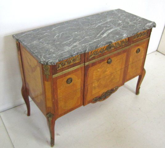 Bronze mounted. 3 drawers, beveled gray marble top. Approx. 43" x 19" D x 31.5" H. Please read our terms of sale.