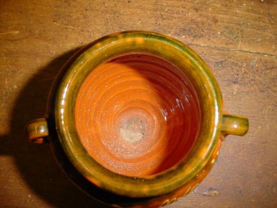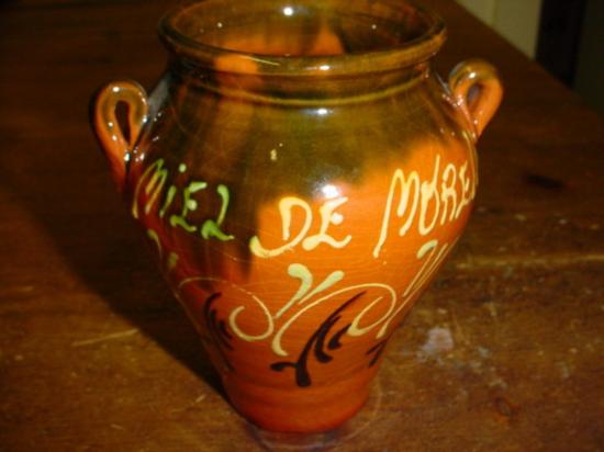 French little jar from Southern France, in PERFECT CONDITION! This charming Pottery with its inscription "Miel de Morella", was used to store honey (miel...in French) Perfect condition! We ship from Texas (not from France)! 5.25 x 5 x 5