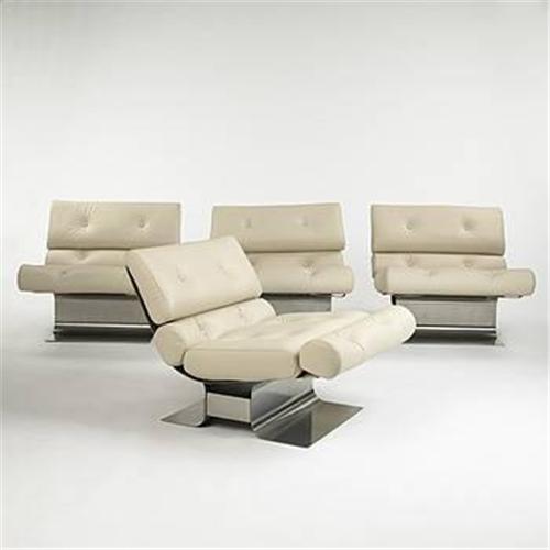 French<BR>lounge chairs, pair<BR>c. 1970<BR>stainless steel, leather<BR>23.5"w x 33"d x 17"h<BR><BR><BR><BR><BR><BR><BR>