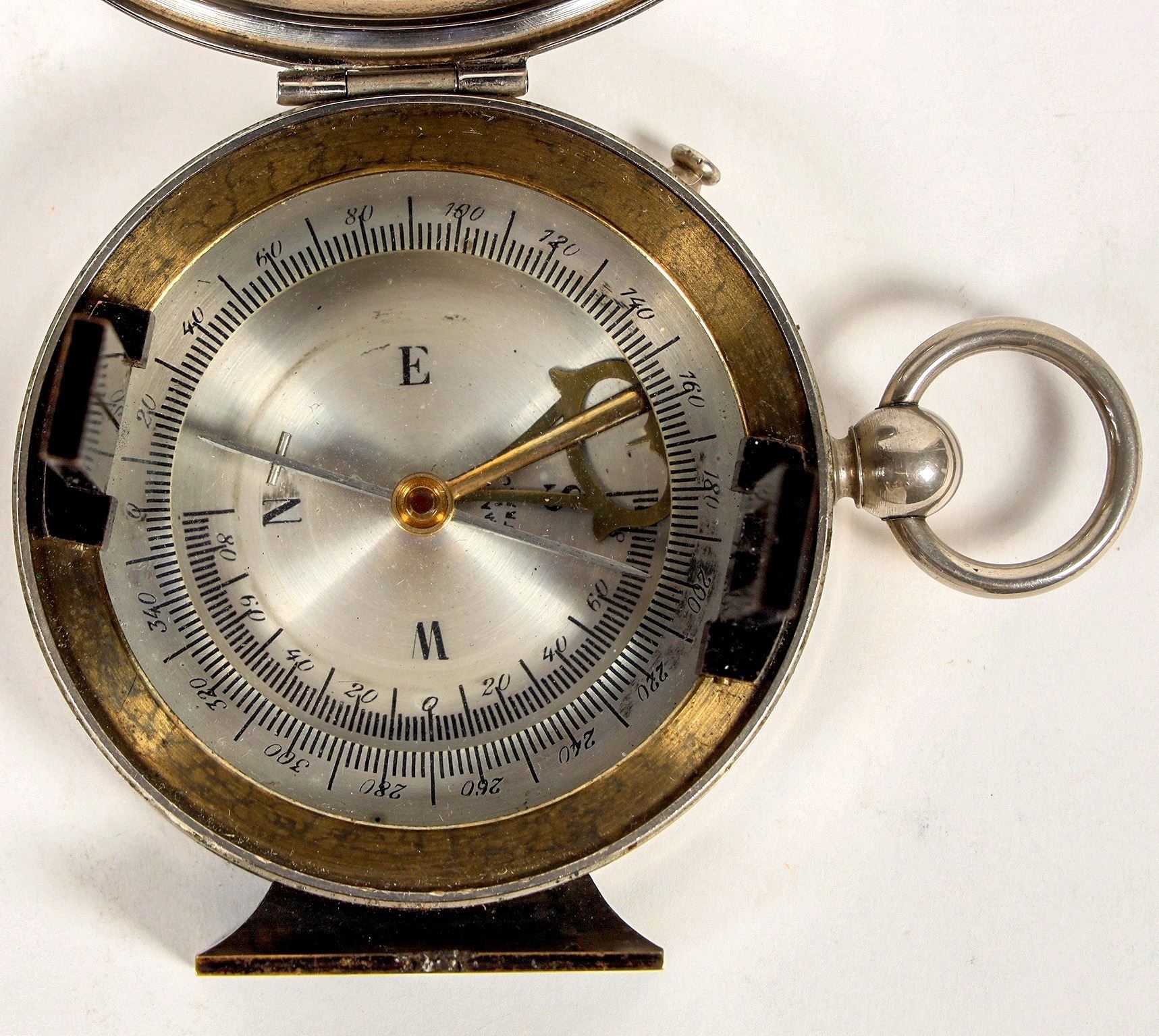 This is a French made pocket/mantel compass with bearing arms and inclinometer. At 2.5 in. in diameter with a mantel pedestal. The card is on two levels and a needle lock. No makers mark. Beautifully made in good working condition. From the Popovich collection. Please see photos for details.