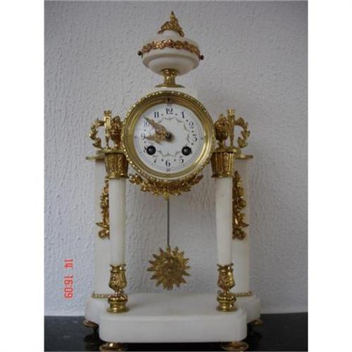 </td></tr><tr> <td> </td></tr><tr> <td>Reference #: C602PE</td></tr><tr><td>Condition:very good</td></tr><tr><td>Year:1890</td></tr><tr><td>Country:France</td></tr><tr><td>Height:16</td></tr><tr><td>Depth:4</td></tr><tr><td>Width:9</td></tr><tr><td>Weight:5</td></tr><tr><td>Title:French mantel clock period 1890</td></tr><tr><td>Materials:marble, gilt-metal</td></tr><tr><td>Location:Haalderen Holland</td></tr></table>