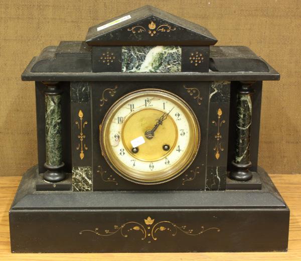 French marble mantle clock circa 1890, having a mixed stone case with gilt incised detail, the dial having Roman numerals and signed W L Lawson Paris, with a Japy Freres movement, 12''h x 14''w x 5.5''d
