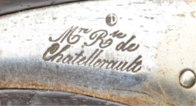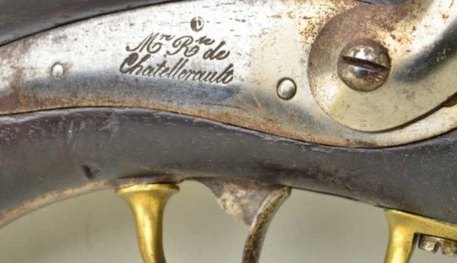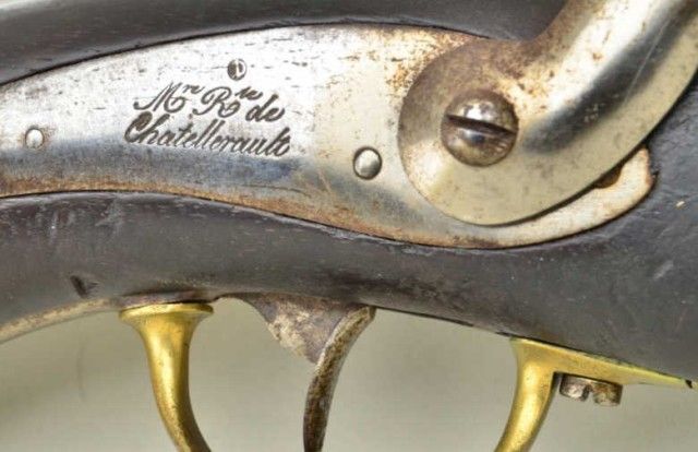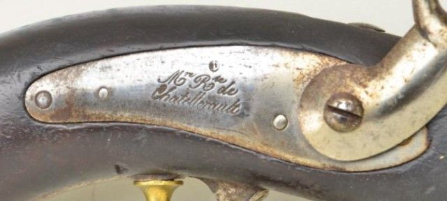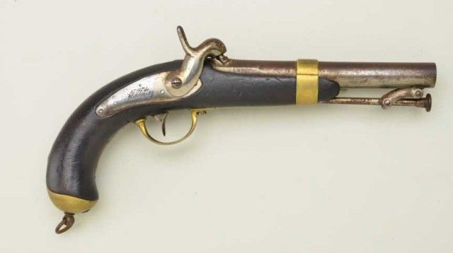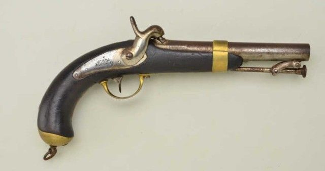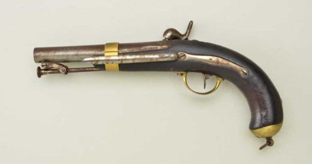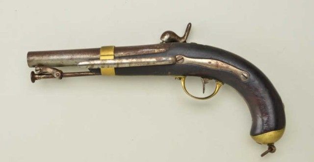 French martial single shot pistol by Chatellerault, Model 1837, .60 cal., 6” barrel, back action lock, brass mountings, wood stock, lanyard ring, swivel ramrod; iron belt hook. This gun is in overall goodcondition showing a dark brown patina on barrel, crisp action, good markings and overall good wood with old mars and scratches from carry and storage. Est.: $400-$800.