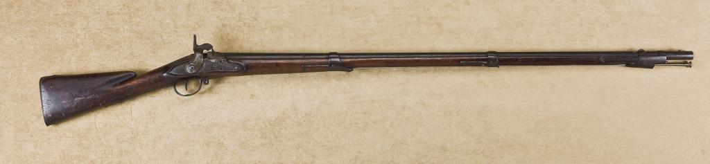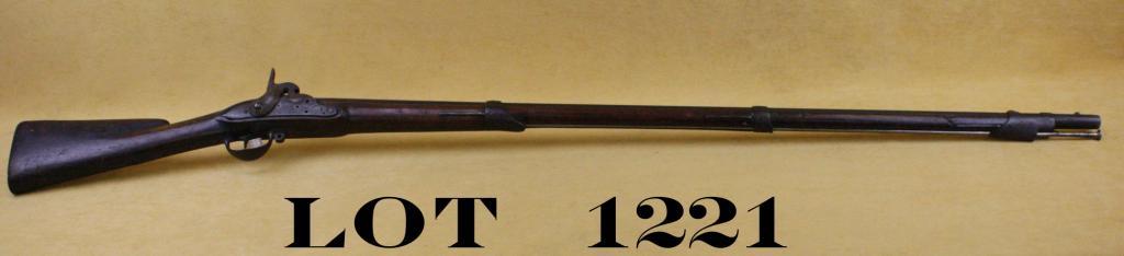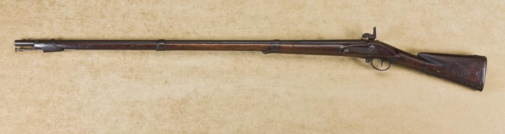 French new-model 1774 musket, .69 caliber, type purchased by Ben Franklin for the state of Virginia and showing Baker type cone in barrel conversion with “for looks only” Confederate style bolster. The musketmeasures 60” overall with 44” barrel and shows a deep brown patina finish with scattered light to moderate erosion and surface pitting and slightly heavier pitting at firing areas. The lock markings arevisible, the left side of breech is proofed “D75”. The stock shows a deep patina with some small dings, mars, dents, slight losses. The rear swivel has been removed from the triggerguard and the arm is good as originaloverall with correct bands and springs and a replacement ramrod of the correct style. Est: $4,000 - $8,000