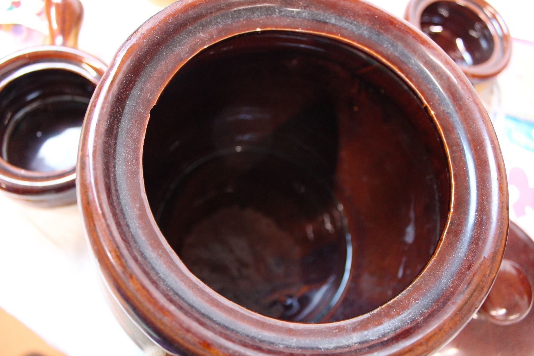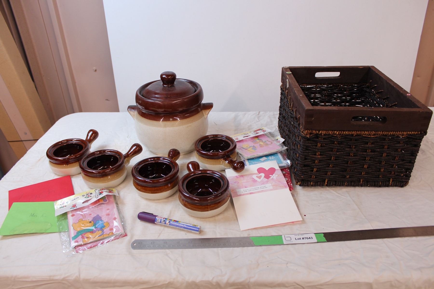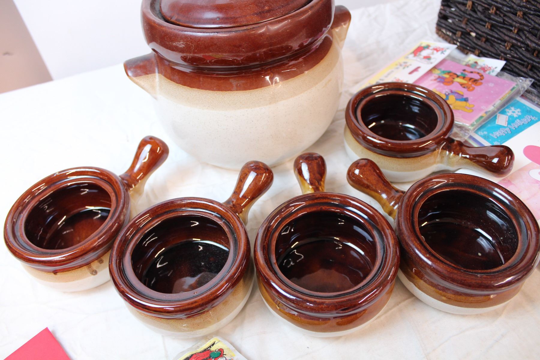 French onion soup bowls and misc. In wicker basket