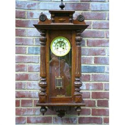 German cased French movement original from the factory guaranteed correct 8 day, time and strike with a French mercury temperature compensating pendulum allows excellent timekeeping. Case has some old worm holes however not detracting to the appearance. The glass is old and wavey. The open escapement dial is perfect no cracks, nicks, etc. and shows the jewel pallets.