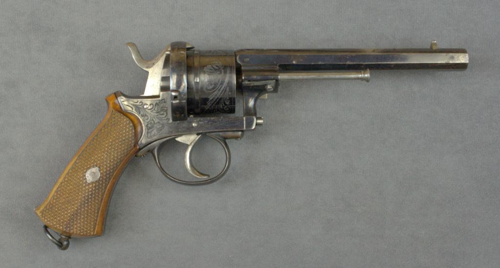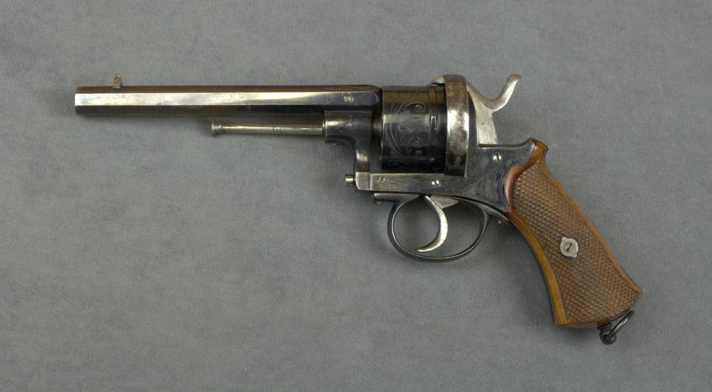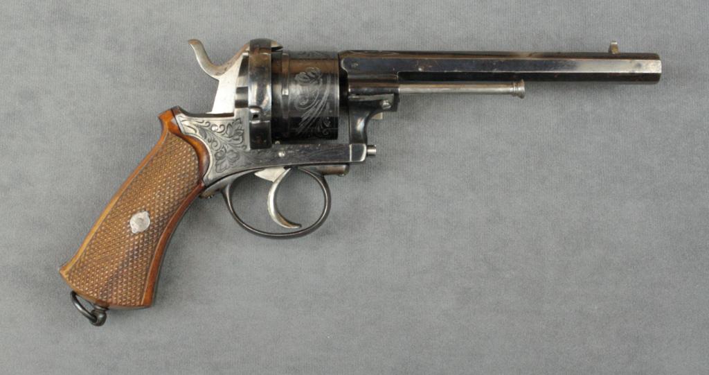 French pinfire revolver, 11mm cal., 6” octagon barrel, blue finish, engraved frame and cylinder, checkered wood grips, #23. This gun is in overall excellent condition showing approx. 80% original blue finish,tasteful period engraving, crisp action, no maker marks, very good to fine bore, excellent grips; lanyard ring present. Est.: $400-$800.