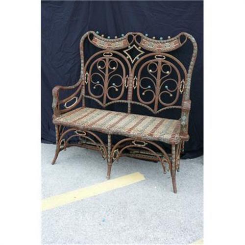 Very unusual turn of the century French rattan bench with lots of details. All original.