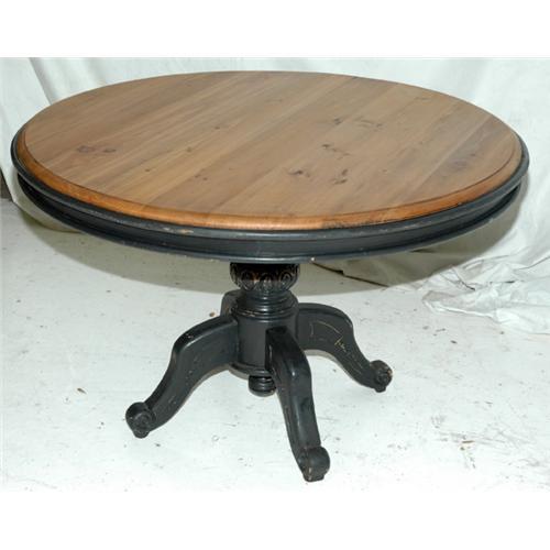 This a a very nice wine table. It is all hand made of solid wood and has been finished it a shabby chic Black . It has a nice carving all round the center of the pedestal and on the legs