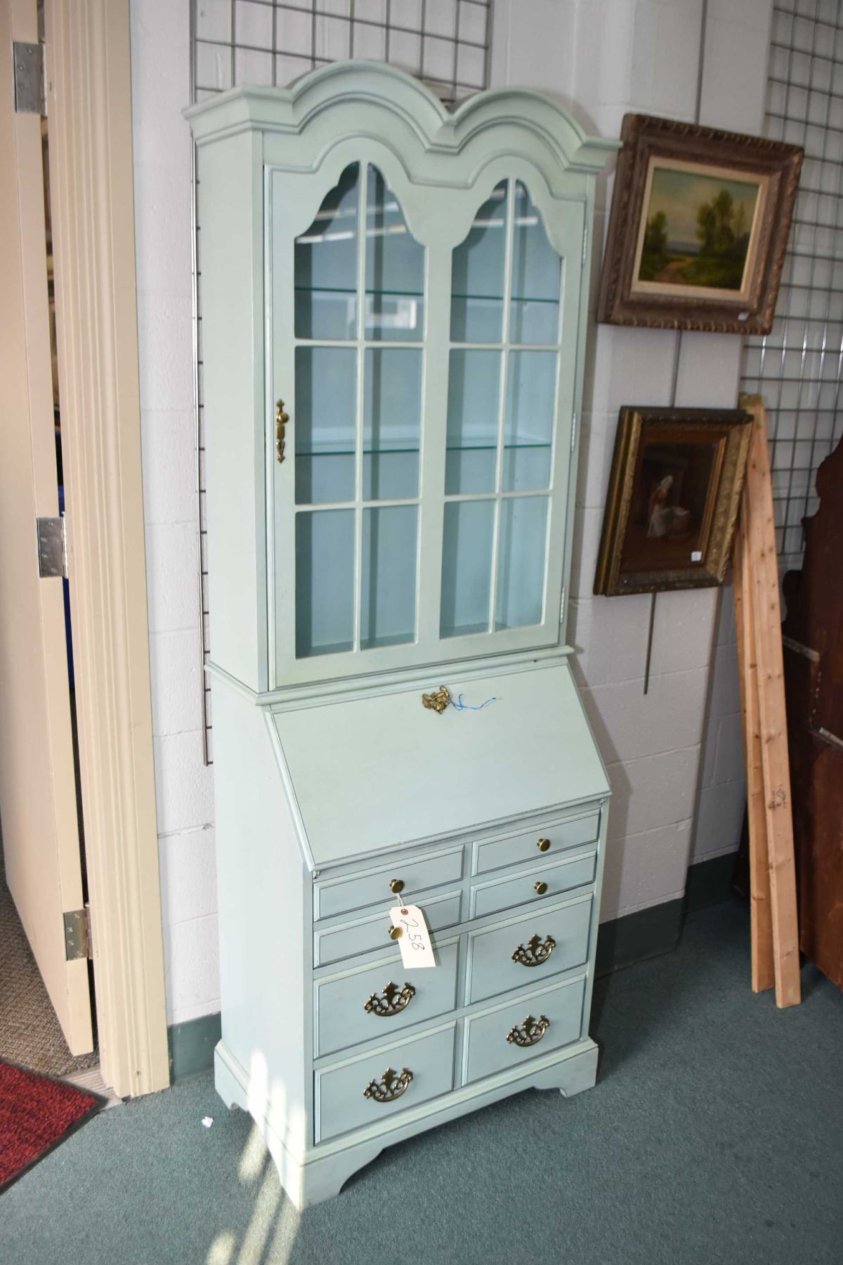 French shabby chic drop front secretaire with fitted interior and glazed bookcase on top made by Jasper cabinet
