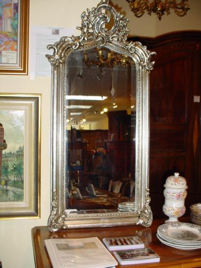 Wonderful contemporary silver Louis XV style mirror made in France using the same method of work than 19th century. This mirror was made of wood and plaster with beveled glass. Very good condition. Don't worry for the shipping (we ship from Texas, not from France) h-44.75/ w22