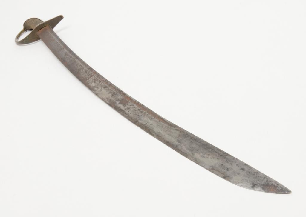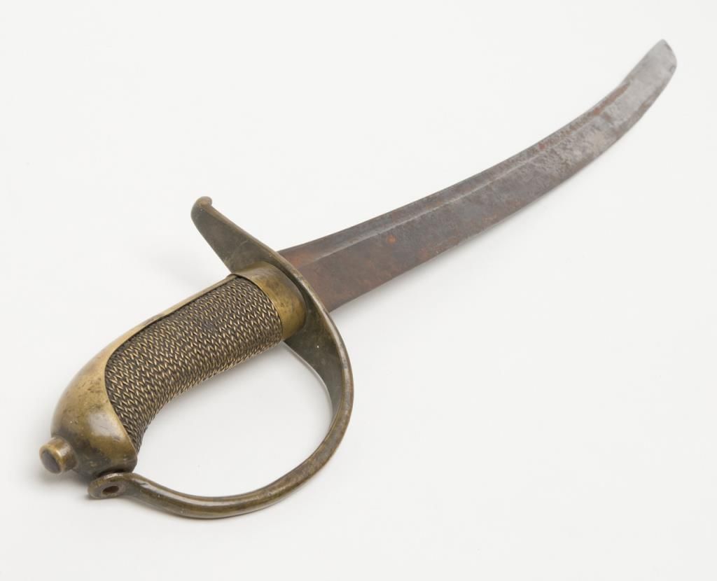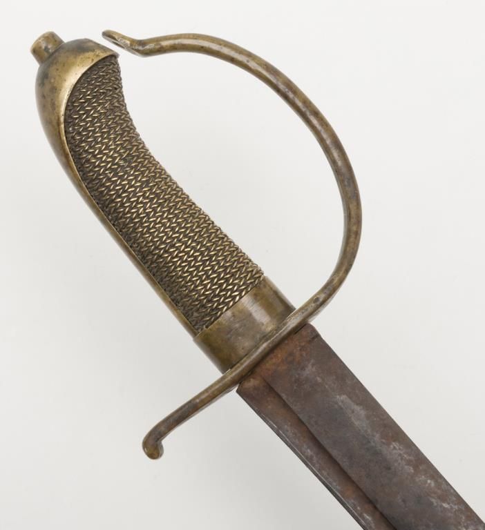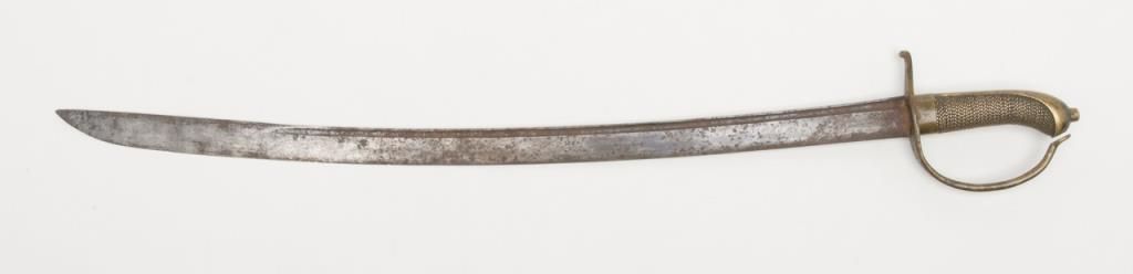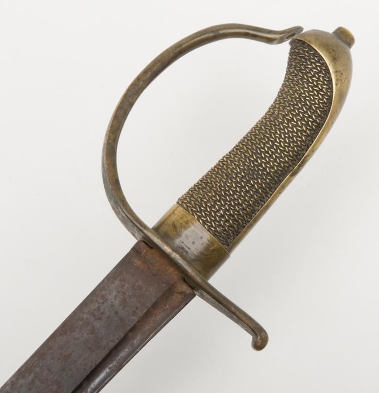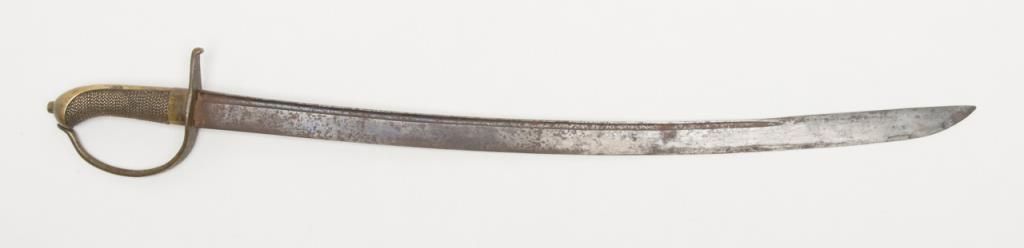 French style cutlass, approx. 32” overall with a 26-1/2” blade, brass grip and guard, un-cleaned dark patina; guard missing rear retaining screw. Est.: $50-$100.