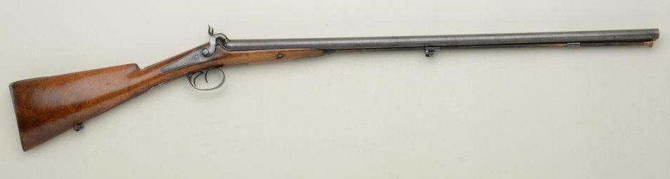 French style double barrel shotgun, late percussion era, back action locks, 12 gauge, open choked, 30-3/4" barrels, 46" overall. Metal surfaces show a gray to brown patina, stocks lightly refinished and show a goodburl wood grain, action working, good overall. A good quality shotgun. Est.: $300-$600