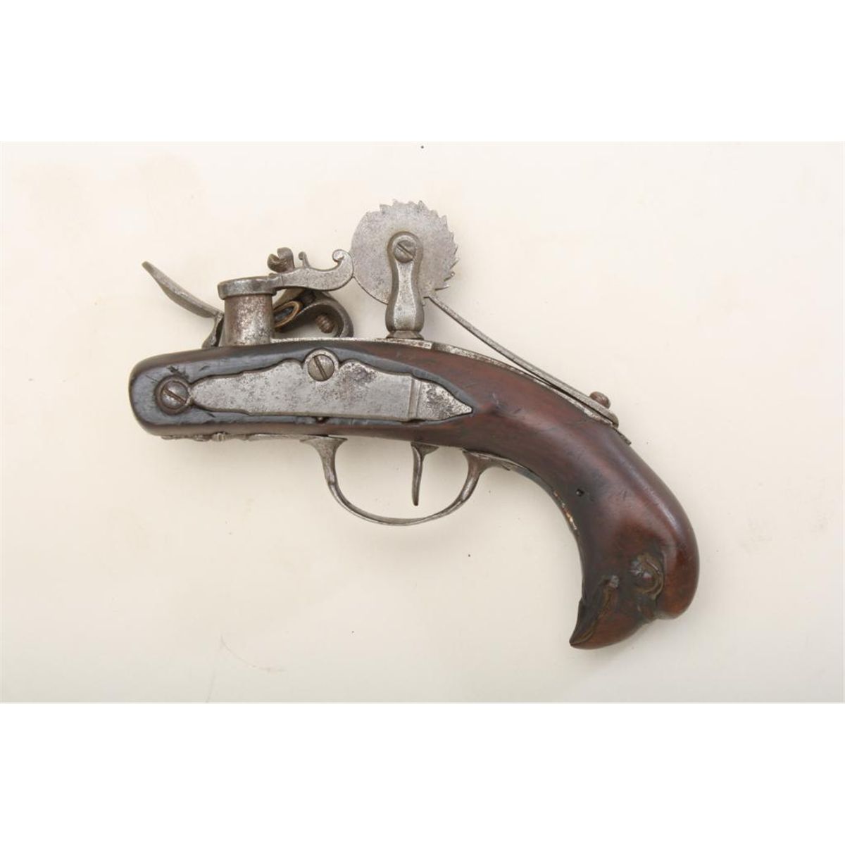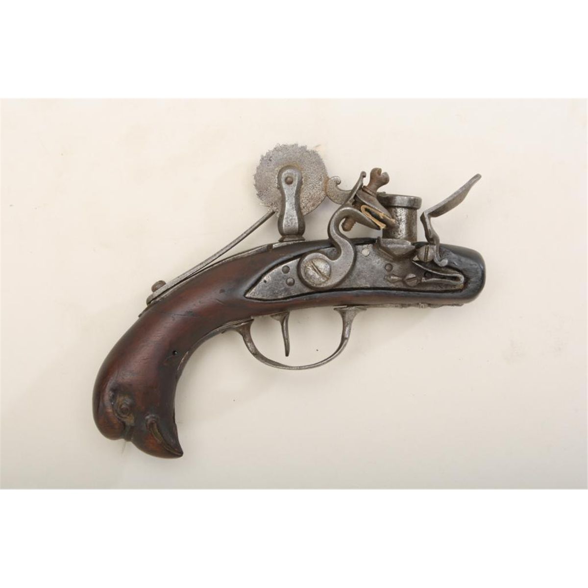 French style flintlock powder tester circa 1740 to 1780. 6-1/4” overall resembling flintlock pistol of this era showing carved eagle butt. The metal surfaces show light to somewhat heavy scattered pitting and erosion. The stock has been broken and the wrist and nicely repaired, shows some light refinishing. There are some small losses to the wood around the lock and sideplate that are minor. Carving and eagle head are good.From the Keith Coulter collection. Est: $750 - $1,500