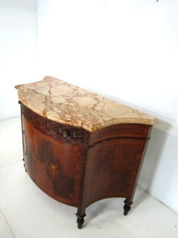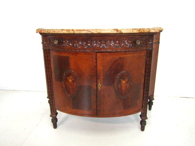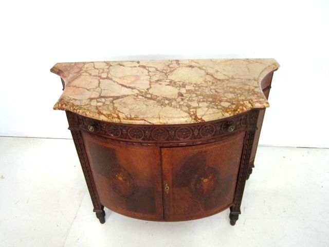 Louis XVI, serpentine side, curved front, rouge marble, marble repaired, needs refinishing. Approx. 51" W x 37" H x 23.5" D. Please read our terms of sale.