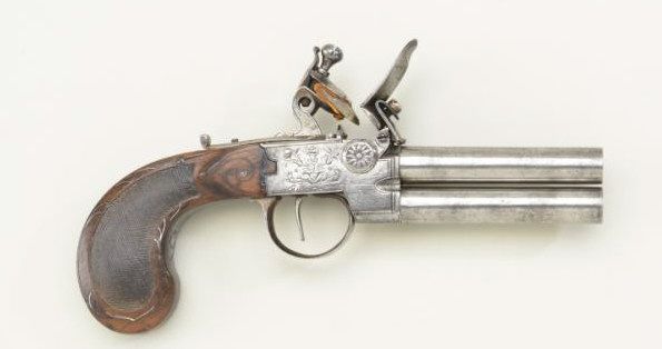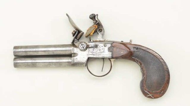 French style over under tap action flintlock pistol circa about 1810. Good condition with light cleaning and small repair to crack in stock. 8 5/8 inches overall and about 42 cal BBL. Stocks show most of their silver wireinlay with some loss. Est.: $700-$1,400.