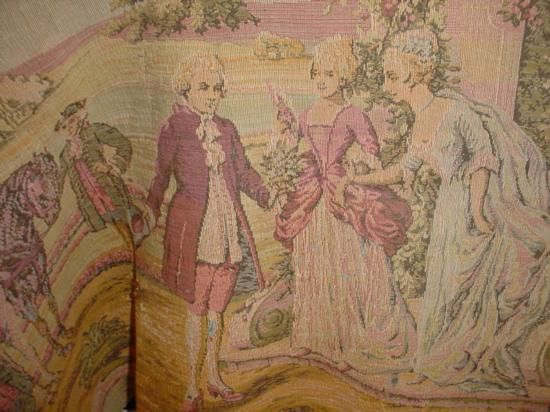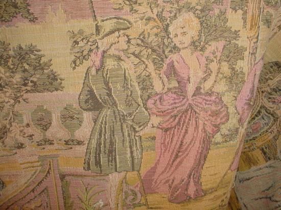 When Louis XIV died, stiff, formal subjects disappeared and everything became an excuse for seductive gallantries. Throughout the reign of Louis XV, the tapestry makers gave free rein to their imagination. Boucher excelled in gallant scenes. This scene is remarkable for the variety and fineness of its colors and the elegance of its details, is an exquisite illustration of his style. This tapestry by Boucher, the king`s artist and protege of Madame de Pompadour, expresses this new style. This tapestry is a "jacquard" and a reproduction (machine-made)...it is an example of the classic work from LES GOBELINS Manufacture with pastel colors. No frame for this tapestry. H: 23.5/ W: 61. Perfect quality. Don't worry for the shipping...we ship from Texas (not from France).