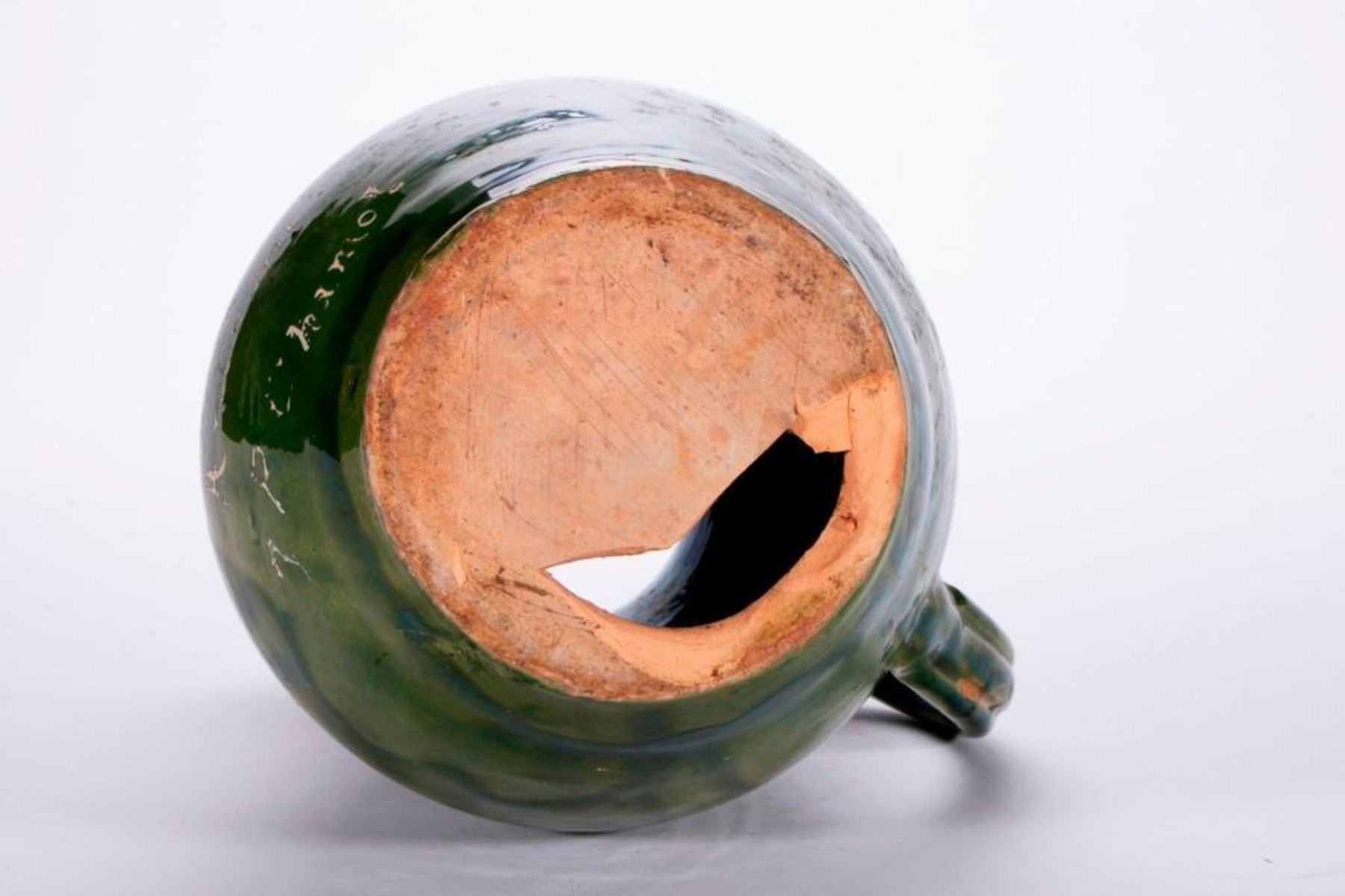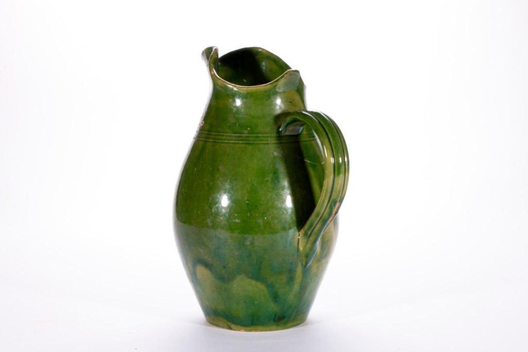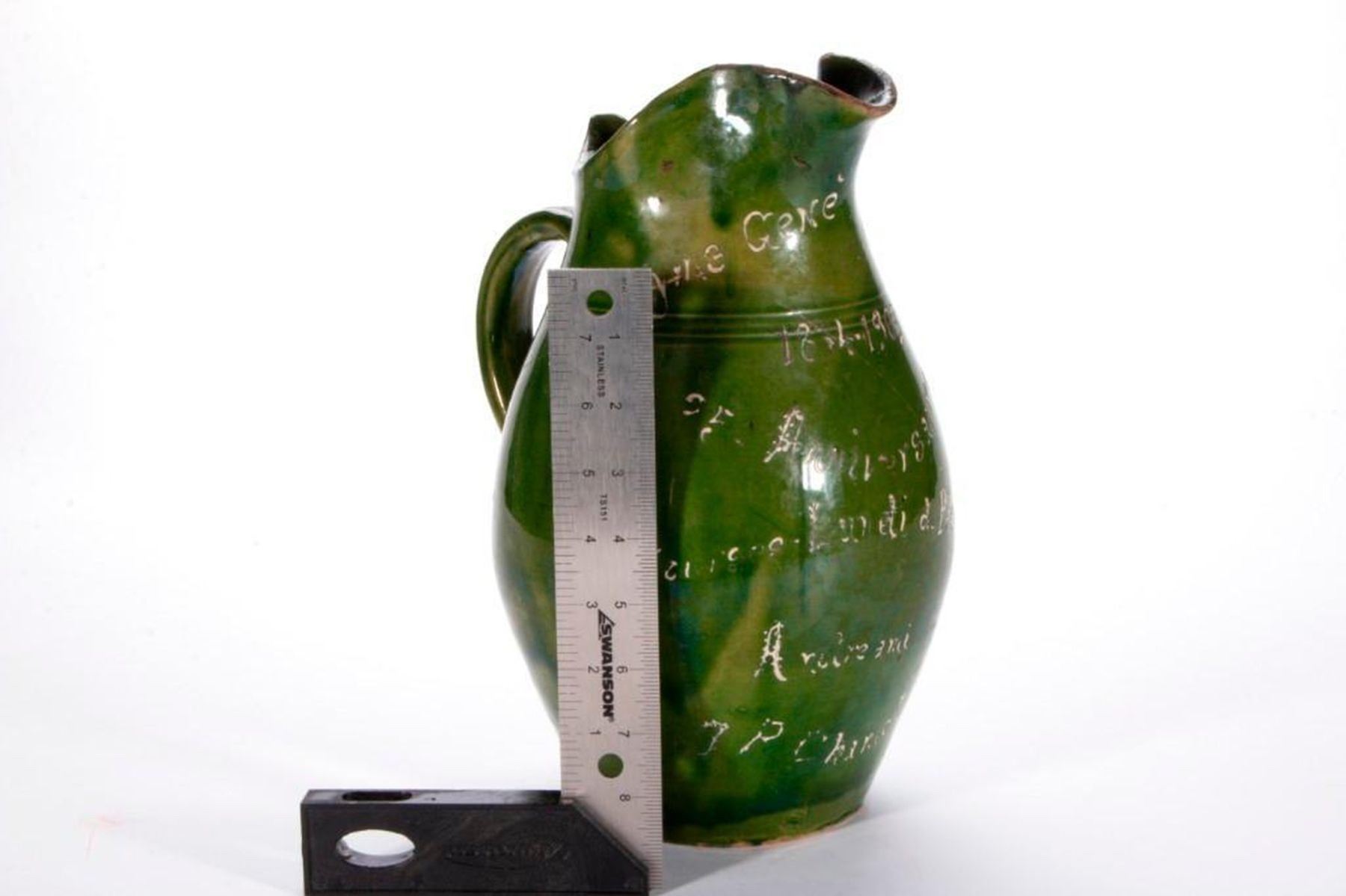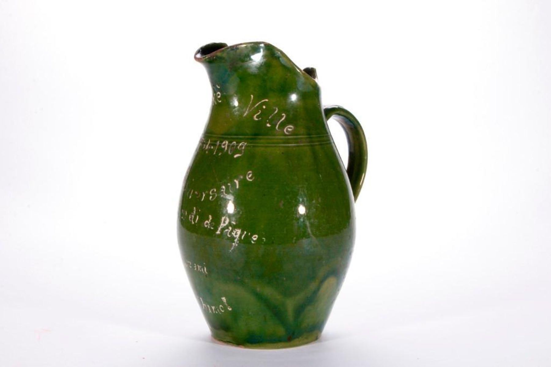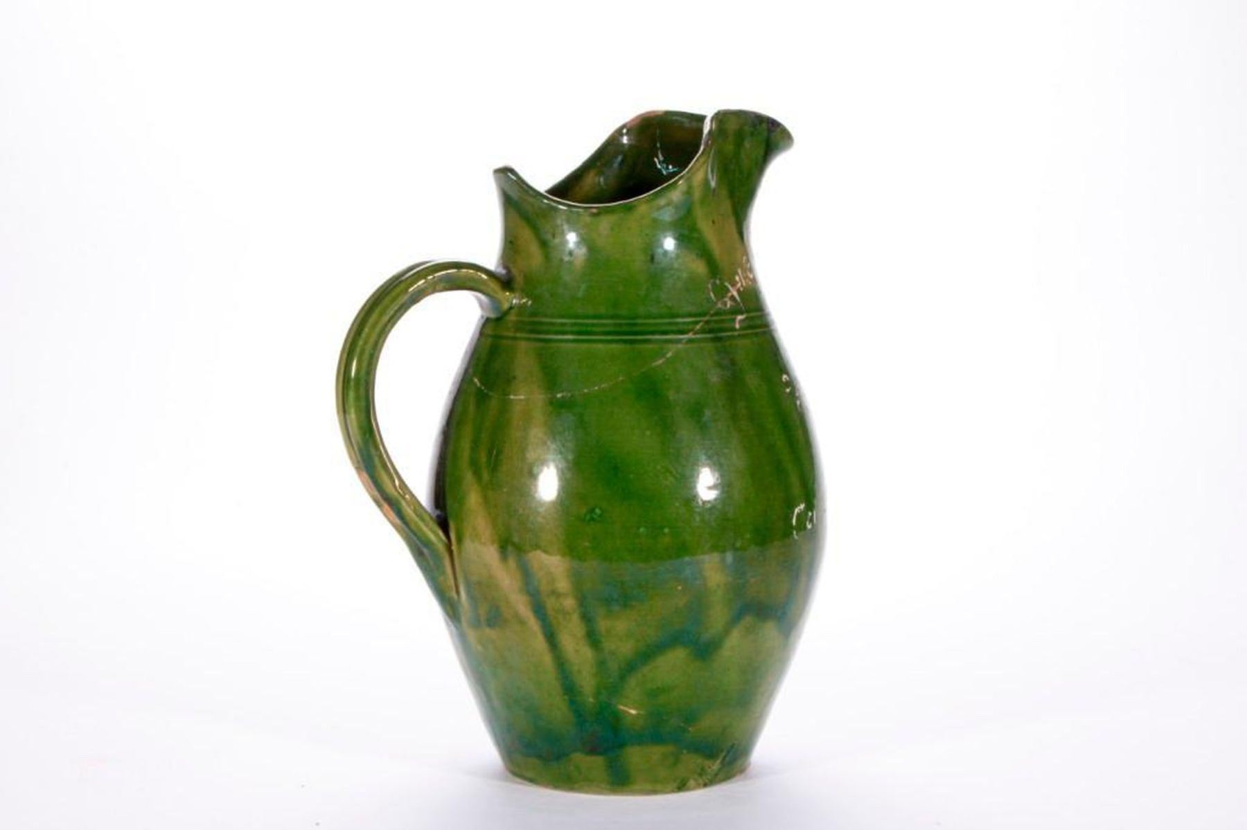 An early 20th century French green glazed inscribed terracotta pitcher. 12 1/2 inches high x 7 x 9. Hairline to body and missing piece to bottom. Items are sold as is. Please inquire about condition if not otherwise stated.