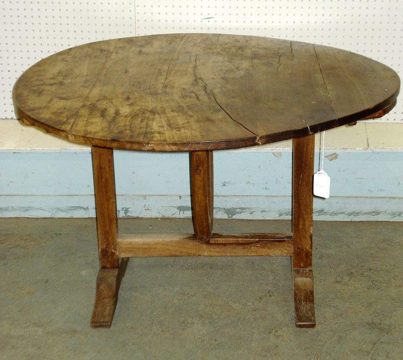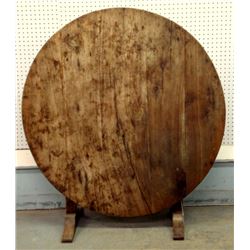 French tilt-top wine tasting table with shoe foot and butterfly swing support. Mortised through construction. 44.75"D of open top x 27.25"H . Note: Top is in slightly warped with several shrinkage cracks otherwise good condition. Late 18th to early 19th century.