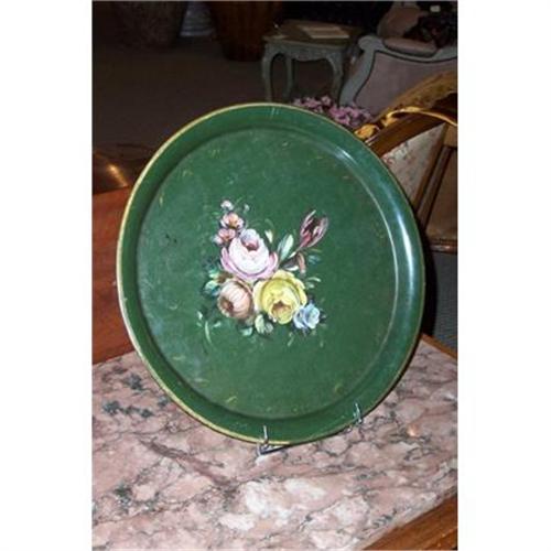 Nice green tole tray from France with flowers in middle. Good condition and very decorative