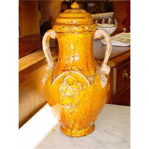 Wonderful French urn pot with its lid made of ceramic with antique patina. Old yellow color.