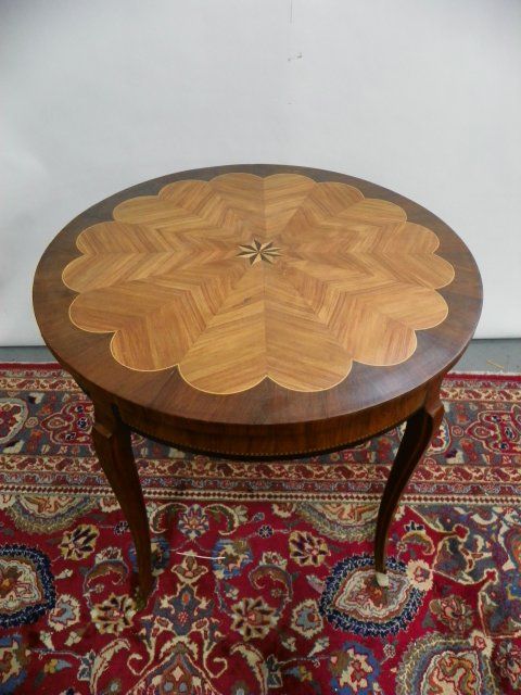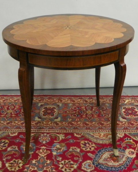 With sunburst & starburst inlaid top with bronze sabo. Approx. 29" H x 29" across. Please read our terms of sale.