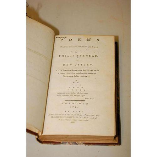 Freneau, Philip - of New Jersey. Poems Written Between the Years 1768-1794. Monmouth, NJ: Printed at the Press of the Author, 1795. 8vo - over 7¾" - 9¾" tall. Hard Cover. Ex-Library. Very Good Condition. Date also shown as - American Independence- XIX. New Edition, revised and corrected. xv [1] 455pp, Errata, bound in 3/4 leather & marbled paper, raised bands on spine, binding & hinges tight.