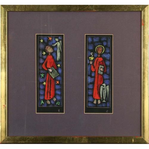 <table width="100%" border="0" cellspacing="0" cellpadding="4"><tr><td><em> </em></td></tr><tr> <td width="100%"> These two bright and inviting acrylic paintings were painted to be stained glass window designs for St. John Lutheran Church in Taylor, Mi. The paintings give the feel that they were designed for that purpose, and look a lot like stained glass windows themselves. The use of the bright primary colors and stylized, yet easily interpreted forms make these paintings worth a longer look. Each painting measures 8.5? x 3?, and are placed together in blue mat and gold colored wood frame that makes the entire picture 15? x 16?. </td></tr><tr> <td> </td></tr><tr> <td>Reference #: 9096</td></tr><tr><td>Condition:very good</td></tr><tr><td>Year:0000</td></tr><tr><td>Height:15</td></tr><tr><td>Width:16</td></tr><tr><td>Title:Frere Eric - Two saints John devine, John</td></tr><tr><td>Location:Grosse Pointe Park, MI. 48230, USA</td></tr></table>
