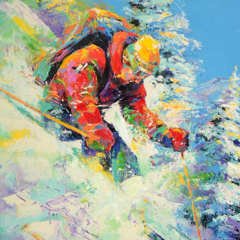 "Fresh Powder" is a limited edition hand embellished giclee on canvas by Malcolm Farley, numbered and hand signed by the artist. Includes Certificate of Authenticity. Measures approx. 27" x 36" (image).