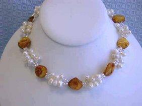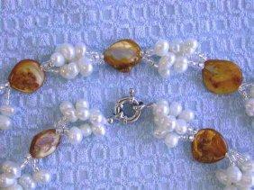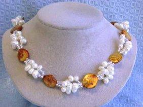 This is a Fresh Water Pearl Necklace with and Mother of Pearls. The necklace has a Silver Clasp and its length is approximately 19 inches long.