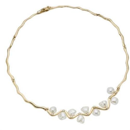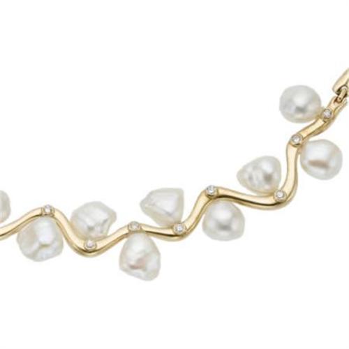 <B>Freshwater Cultured Pearl, Diamond, Gold Necklace</B></I><BR><BR>The necklace features freshwater cultured baroque pearls, enhanced by full-cut diamonds weighing a total of approximately 0.20 carat, bezel set in 14k yellow gold. Gross weight 17.00 grams. <BR><I>Length: 16 inches</B></I> <B>Condition Report:</B> Very good condition.<BR><BR><b>Shipping:</b> Miscellaneous Collectibles, Smal (<a target="_blank" href="http://www.heritageauctions.com/common/shipping.php">view shipping information</a>)
