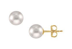 A pair of round freshwater cultured pearl stud earrings with a size of 10 mm is made in 14K yellow gold. These pearl studs are available in either screw-back or push-back.