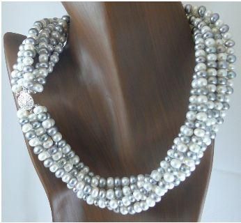 Freshwater Multistrand Pearl Necklace With Silver Clasp. The Length Of The Necklace Is 18". The Pearls Are A Rich Gray And White In Color.
