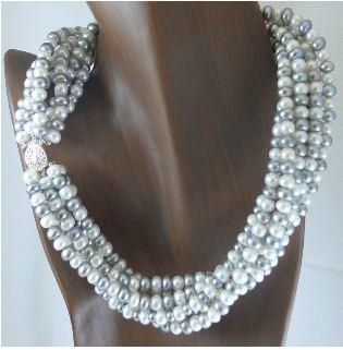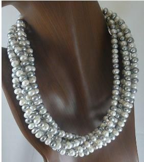 Freshwater Multistrand Pearl Necklace With Silver Clasp. The Length Of The Necklace Is 18". The Pearls Are A Rich Gray And White In Color.