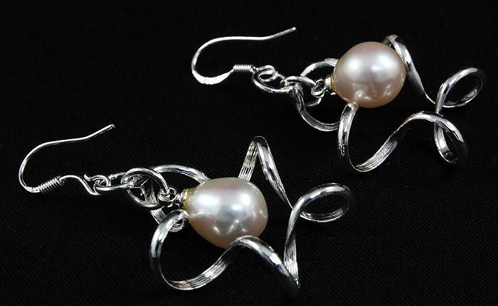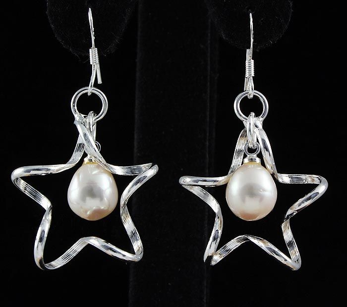 Freshwater Pearl 4.29g Dangling Silver Earring **|**|** 1.72 Inches Long Star Spiral Dangling Hook Earring with White Freshwater Pearls 7-8mm in Size ; MSRP: $100