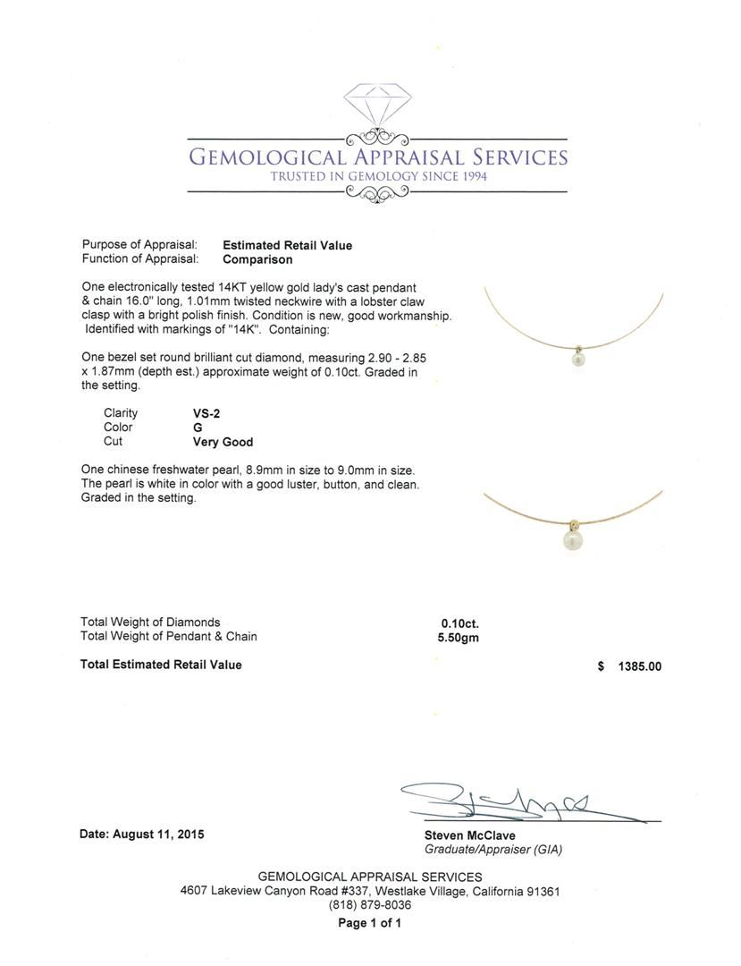 One electronically tested 14KT yellow gold lady's cast pendant & chain 16.0" long, 1.01mm twisted neckwire with a lobster claw clasp with a bright polish finish. Identified with markings of "14K". Condition is new, good workmanship. Containing: One bezel set round brilliant cut diamond, measuring 2.90 - 2.85 x 1.87mm (depth est.) approximate weight of 0.10ct. Graded in the setting. Clarity: VS-2. Color: G. Cut Very Good One Chinese freshwater pearl, 8.9mm in size to 9.0mm in size. The pearl is white in color with a good luster, button, and clean. Graded in the setting. Total Weight of Diamonds 0.10ct. Total Weight of Pendant & Chain 5.50gm. GAS Appraised at $1,385.00.