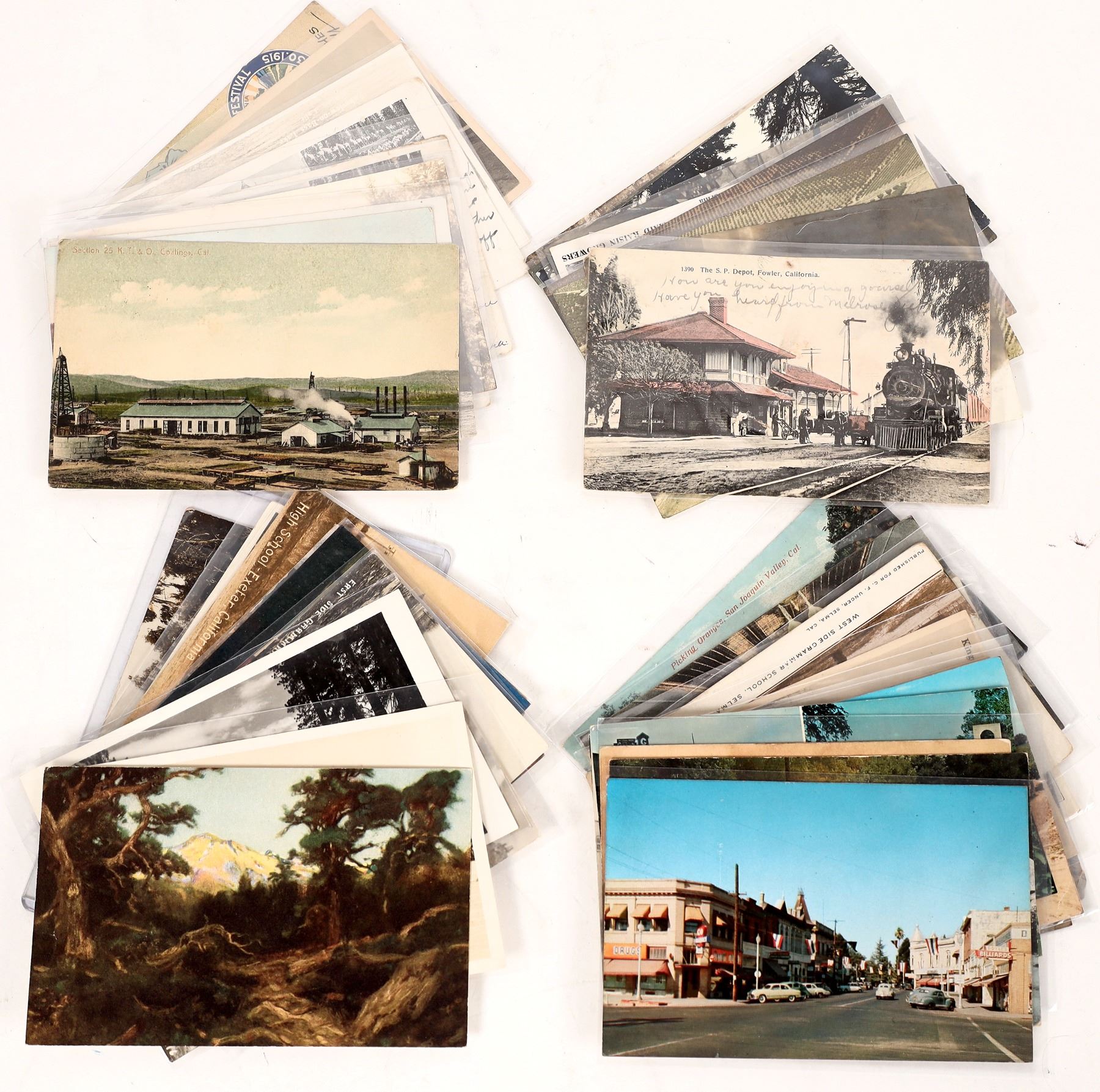 Lot of 45. Eighteen are RPC's, Two PMC's. few wht border cards. Several cities: Fresno, Coalinga, Fowler, Exeter, Kingsburg, Colfax and more. Postmarks: Fresno, Fresno & Coalinga R.P.O., Malaga Ca., Cedar Crest, Coalinga, Clovis, Kingsburg, Lakeshore. One card has a 1 cent Mount Vernon stamp w/portraits of Washington and Green. View i.e; Loading black gold (oil onto tankers), sump fire ( burning the refuse that builds up), Fowler depot w/ steam loco loading, Sun-Maid raisin plant (largest in world at the time), cotton gins Christian Bros. winery and hotels gov't bldgs, schools, lakes, street scenes. California Fresno County Ken Prag Collection